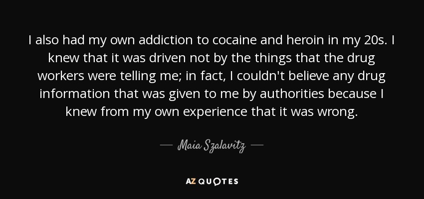 I also had my own addiction to cocaine and heroin in my 20s. I knew that it was driven not by the things that the drug workers were telling me; in fact, I couldn't believe any drug information that was given to me by authorities because I knew from my own experience that it was wrong.