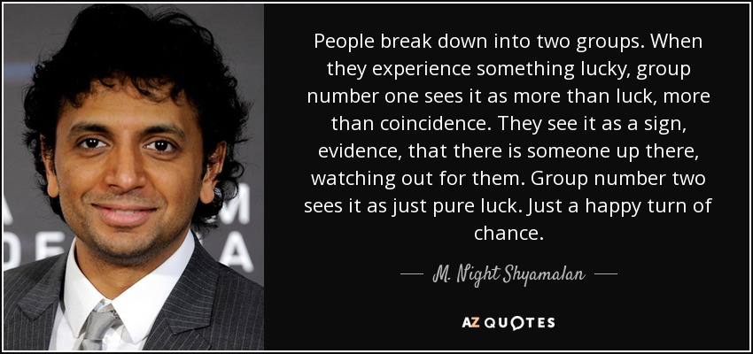 People break down into two groups. When they experience something lucky, group number one sees it as more than luck, more than coincidence. They see it as a sign, evidence, that there is someone up there, watching out for them. Group number two sees it as just pure luck. Just a happy turn of chance.