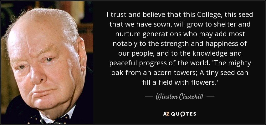 I trust and believe that this College, this seed that we have sown, will grow to shelter and nurture generations who may add most notably to the strength and happiness of our people, and to the knowledge and peaceful progress of the world. 'The mighty oak from an acorn towers; A tiny seed can fill a field with flowers.'