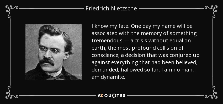 I know my fate. One day my name will be associated with the memory of something tremendous — a crisis without equal on earth, the most profound collision of conscience, a decision that was conjured up against everything that had been believed, demanded, hallowed so far. I am no man, I am dynamite.