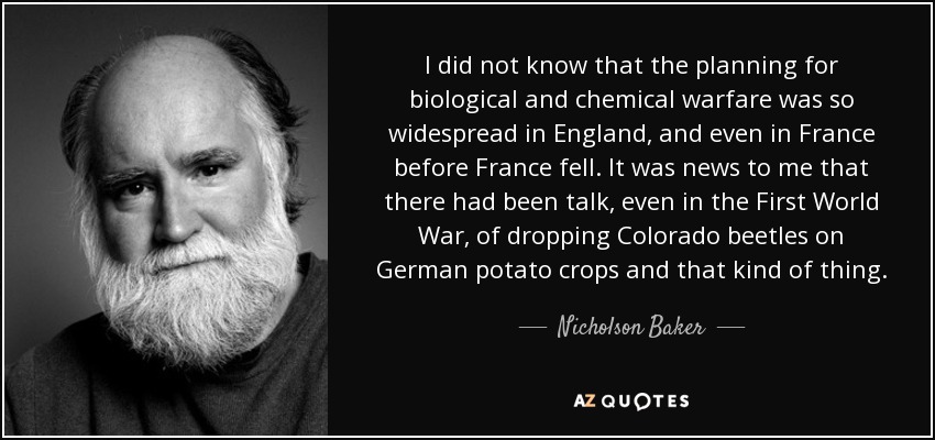 I did not know that the planning for biological and chemical warfare was so widespread in England, and even in France before France fell. It was news to me that there had been talk, even in the First World War, of dropping Colorado beetles on German potato crops and that kind of thing.