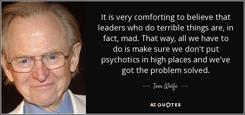 It is very comforting to believe that leaders who do terrible things are, in fact, mad. That way, all we have to do is make sure we don't put psychotics in high places and we've got the problem solved.