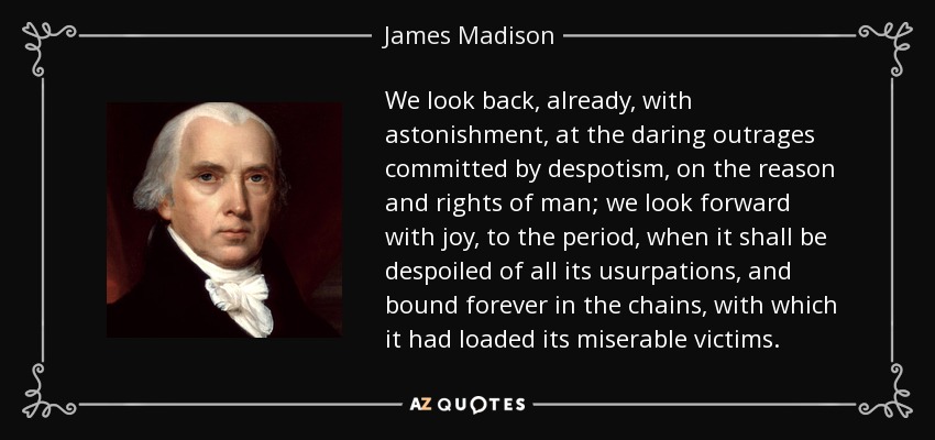 We look back, already, with astonishment, at the daring outrages committed by despotism, on the reason and rights of man; we look forward with joy, to the period, when it shall be despoiled of all its usurpations, and bound forever in the chains, with which it had loaded its miserable victims.