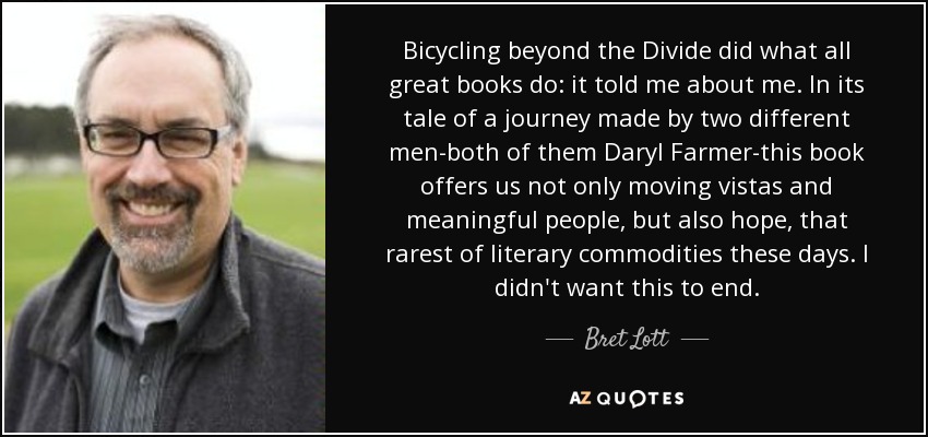 Bicycling beyond the Divide did what all great books do: it told me about me. In its tale of a journey made by two different men-both of them Daryl Farmer-this book offers us not only moving vistas and meaningful people, but also hope, that rarest of literary commodities these days. I didn't want this to end.