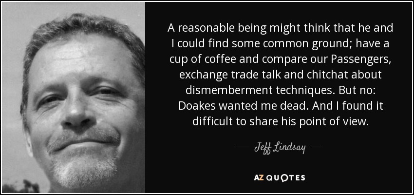 A reasonable being might think that he and I could find some common ground; have a cup of coffee and compare our Passengers, exchange trade talk and chitchat about dismemberment techniques. But no: Doakes wanted me dead. And I found it difficult to share his point of view.