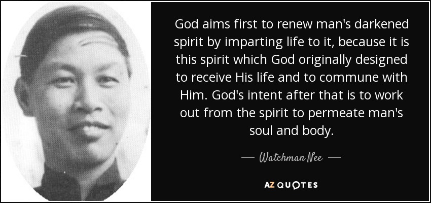 God aims first to renew man's darkened spirit by imparting life to it, because it is this spirit which God originally designed to receive His life and to commune with Him. God's intent after that is to work out from the spirit to permeate man's soul and body.