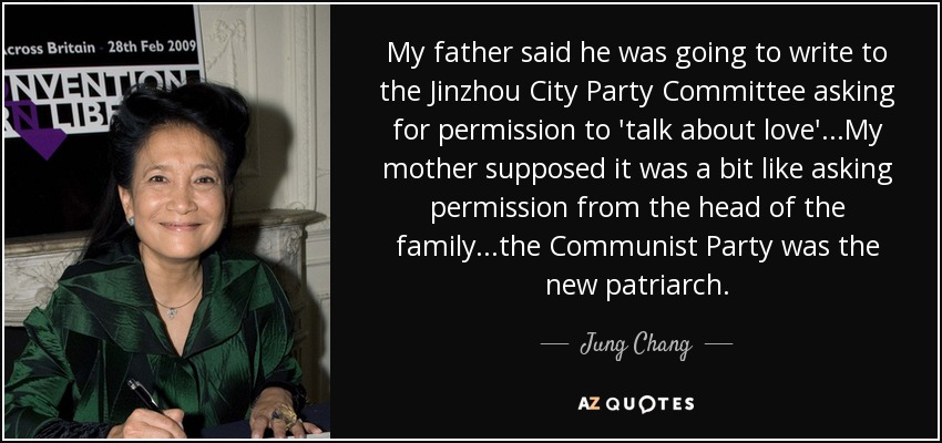My father said he was going to write to the Jinzhou City Party Committee asking for permission to 'talk about love'...My mother supposed it was a bit like asking permission from the head of the family...the Communist Party was the new patriarch.