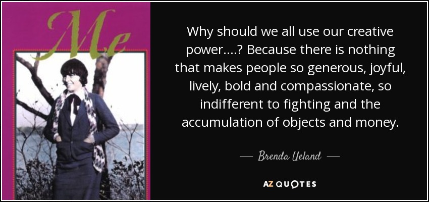 Why should we all use our creative power....? Because there is nothing that makes people so generous, joyful, lively, bold and compassionate, so indifferent to fighting and the accumulation of objects and money.