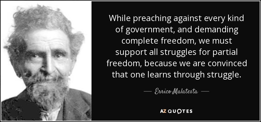 While preaching against every kind of government, and demanding complete freedom, we must support all struggles for partial freedom, because we are convinced that one learns through struggle.