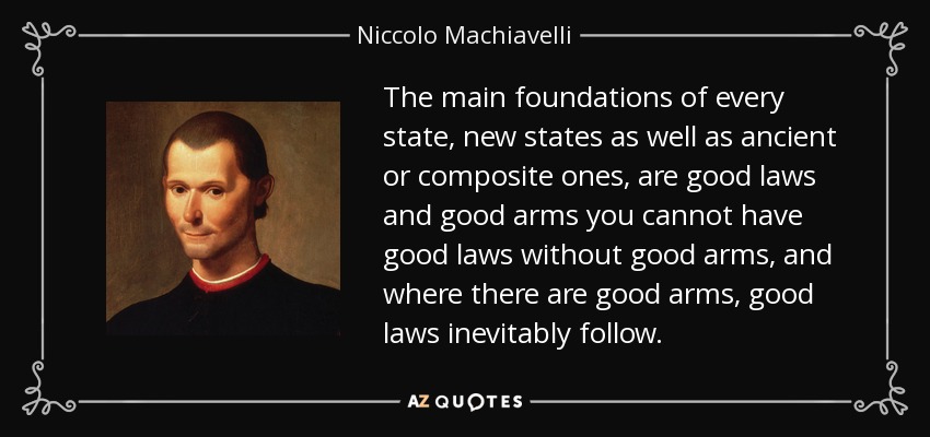 The main foundations of every state, new states as well as ancient or composite ones, are good laws and good arms you cannot have good laws without good arms, and where there are good arms, good laws inevitably follow.