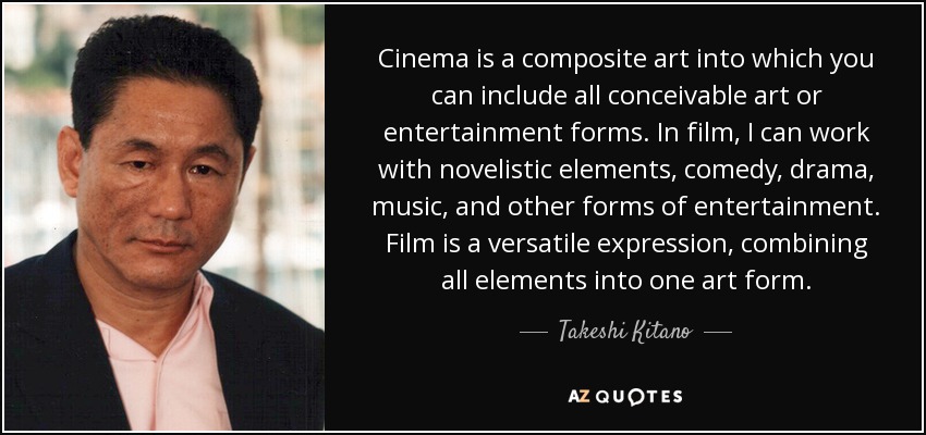 Cinema is a composite art into which you can include all conceivable art or entertainment forms. In film, I can work with novelistic elements, comedy, drama, music, and other forms of entertainment. Film is a versatile expression, combining all elements into one art form.
