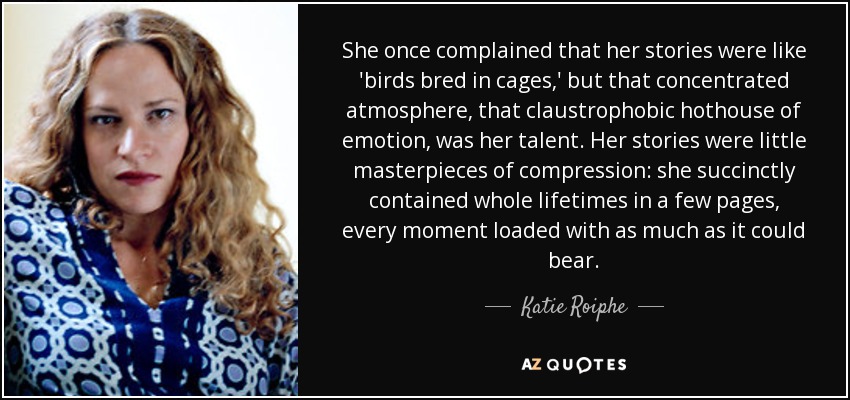 She once complained that her stories were like 'birds bred in cages,' but that concentrated atmosphere, that claustrophobic hothouse of emotion, was her talent. Her stories were little masterpieces of compression: she succinctly contained whole lifetimes in a few pages, every moment loaded with as much as it could bear.