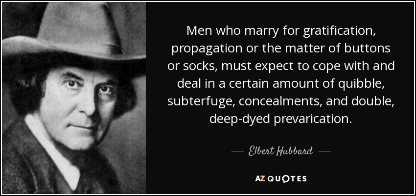 Men who marry for gratification, propagation or the matter of buttons or socks, must expect to cope with and deal in a certain amount of quibble, subterfuge, concealments, and double, deep-dyed prevarication.