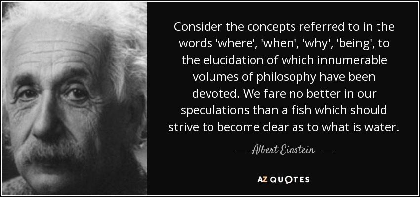 Consider the concepts referred to in the words 'where', 'when', 'why', 'being', to the elucidation of which innumerable volumes of philosophy have been devoted. We fare no better in our speculations than a fish which should strive to become clear as to what is water.