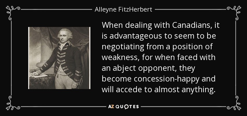 When dealing with Canadians, it is advantageous to seem to be negotiating from a position of weakness, for when faced with an abject opponent, they become concession-happy and will accede to almost anything.