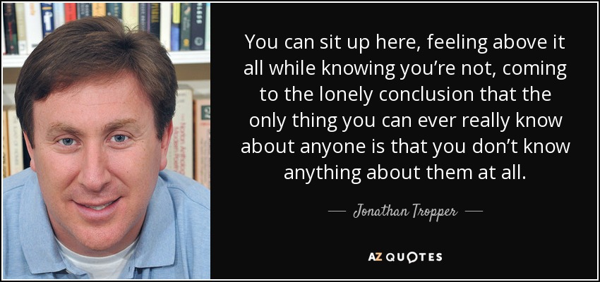 You can sit up here, feeling above it all while knowing you’re not, coming to the lonely conclusion that the only thing you can ever really know about anyone is that you don’t know anything about them at all.