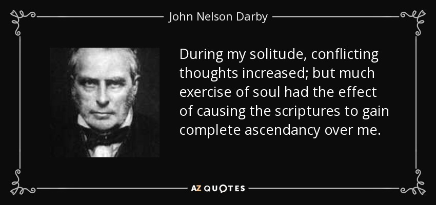 During my solitude, conflicting thoughts increased; but much exercise of soul had the effect of causing the scriptures to gain complete ascendancy over me. I had always owned them to be the Word of GOD . . . the careful reading of the Acts afforded me a practical picture of the early church; which made me feel deeply the contrast with its actual present state; though still, as ever beloved by GOD.