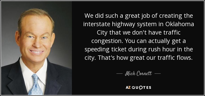 We did such a great job of creating the interstate highway system in Oklahoma City that we don't have traffic congestion. You can actually get a speeding ticket during rush hour in the city. That's how great our traffic flows.