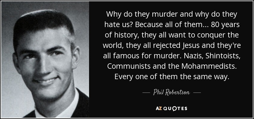 Why do they murder and why do they hate us? Because all of them ... 80 years of history, they all want to conquer the world, they all rejected Jesus and they're all famous for murder. Nazis, Shintoists, Communists and the Mohammedists. Every one of them the same way.