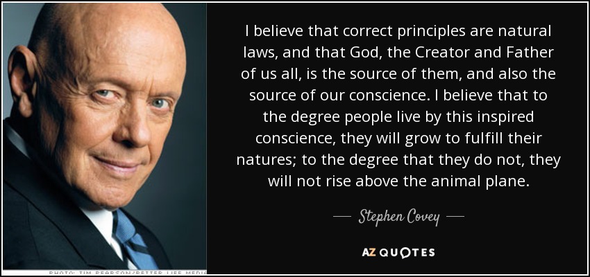I believe that correct principles are natural laws, and that God, the Creator and Father of us all, is the source of them, and also the source of our conscience. I believe that to the degree people live by this inspired conscience, they will grow to fulfill their natures; to the degree that they do not, they will not rise above the animal plane.