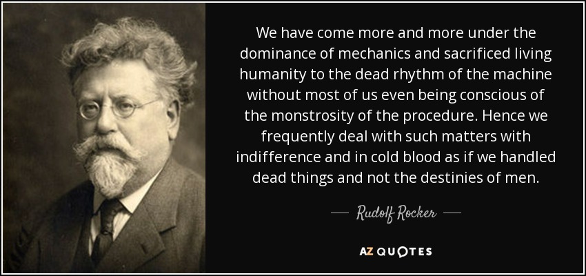 We have come more and more under the dominance of mechanics and sacrificed living humanity to the dead rhythm of the machine without most of us even being conscious of the monstrosity of the procedure. Hence we frequently deal with such matters with indifference and in cold blood as if we handled dead things and not the destinies of men.
