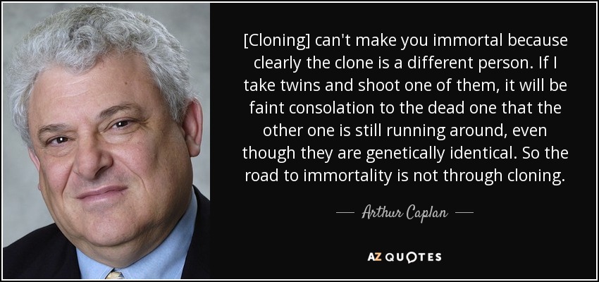 [Cloning] can't make you immortal because clearly the clone is a different person. If I take twins and shoot one of them, it will be faint consolation to the dead one that the other one is still running around, even though they are genetically identical. So the road to immortality is not through cloning.
