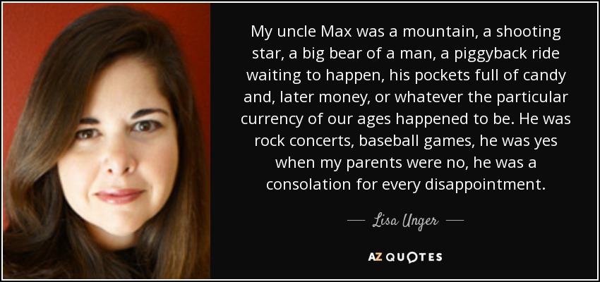 My uncle Max was a mountain, a shooting star, a big bear of a man, a piggyback ride waiting to happen, his pockets full of candy and, later money, or whatever the particular currency of our ages happened to be. He was rock concerts, baseball games, he was yes when my parents were no, he was a consolation for every disappointment.