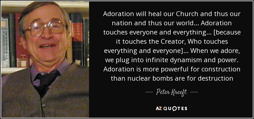 Adoration will heal our Church and thus our nation and thus our world... Adoration touches everyone and everything... [because it touches the Creator, Who touches everything and everyone]... When we adore, we plug into infinite dynamism and power. Adoration is more powerful for construction than nuclear bombs are for destruction