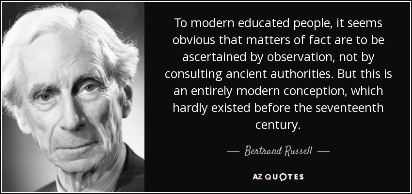 To modern educated people, it seems obvious that matters of fact are to be ascertained by observation, not by consulting ancient authorities. But this is an entirely modern conception, which hardly existed before the seventeenth century.