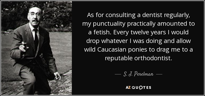 As for consulting a dentist regularly, my punctuality practically amounted to a fetish. Every twelve years I would drop whatever I was doing and allow wild Caucasian ponies to drag me to a reputable orthodontist.
