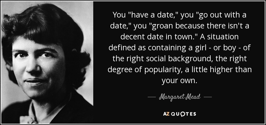 You "have a date," you "go out with a date," you "groan because there isn't a decent date in town." A situation defined as containing a girl - or boy - of the right social background, the right degree of popularity, a little higher than your own.