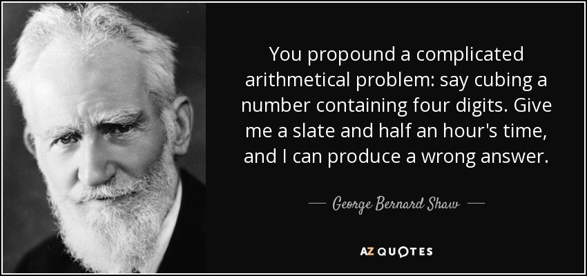 You propound a complicated arithmetical problem: say cubing a number containing four digits. Give me a slate and half an hour's time, and I can produce a wrong answer.