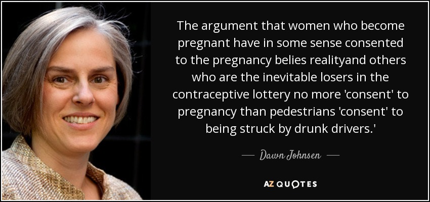 The argument that women who become pregnant have in some sense consented to the pregnancy belies realityand others who are the inevitable losers in the contraceptive lottery no more 'consent' to pregnancy than pedestrians 'consent' to being struck by drunk drivers.'