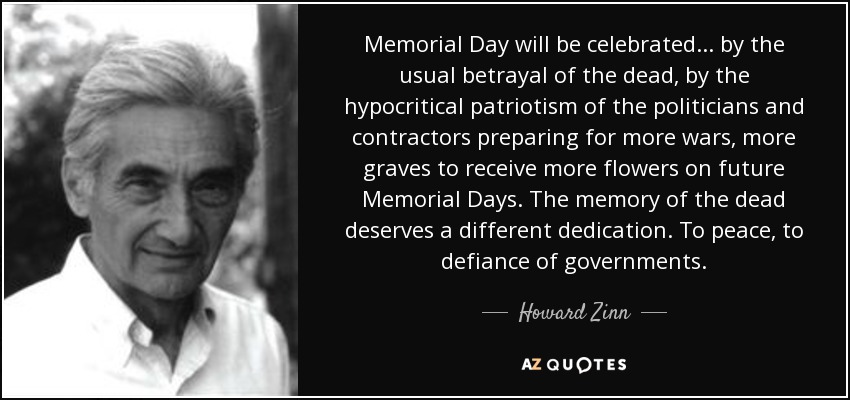 Memorial Day will be celebrated ... by the usual betrayal of the dead, by the hypocritical patriotism of the politicians and contractors preparing for more wars, more graves to receive more flowers on future Memorial Days. The memory of the dead deserves a different dedication. To peace, to defiance of governments.