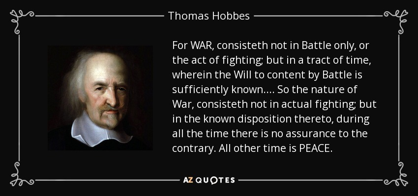 For WAR, consisteth not in Battle only, or the act of fighting; but in a tract of time, wherein the Will to content by Battle is sufficiently known.... So the nature of War, consisteth not in actual fighting; but in the known disposition thereto, during all the time there is no assurance to the contrary. All other time is PEACE.