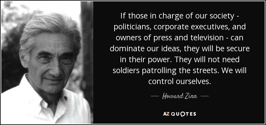 If those in charge of our society - politicians, corporate executives, and owners of press and television - can dominate our ideas, they will be secure in their power. They will not need soldiers patrolling the streets. We will control ourselves.