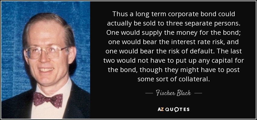 Thus a long term corporate bond could actually be sold to three separate persons. One would supply the money for the bond; one would bear the interest rate risk, and one would bear the risk of default. The last two would not have to put up any capital for the bond, though they might have to post some sort of collateral.
