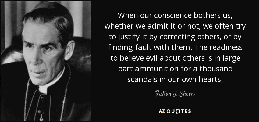 When our conscience bothers us, whether we admit it or not, we often try to justify it by correcting others, or by finding fault with them. The readiness to believe evil about others is in large part ammunition for a thousand scandals in our own hearts.