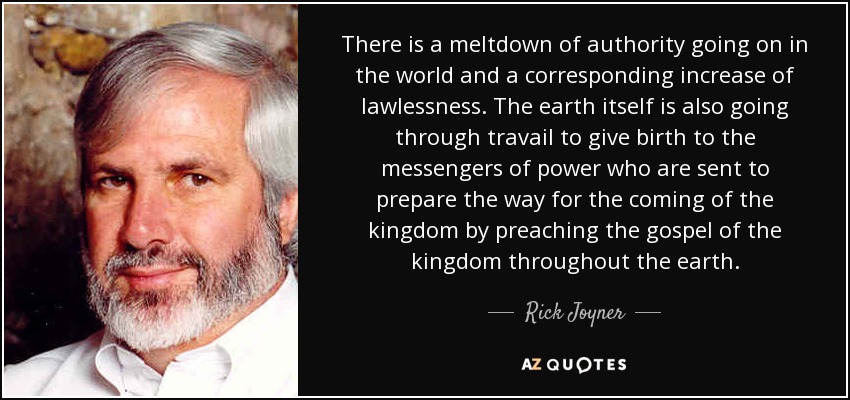 There is a meltdown of authority going on in the world and a corresponding increase of lawlessness. The earth itself is also going through travail to give birth to the messengers of power who are sent to prepare the way for the coming of the kingdom by preaching the gospel of the kingdom throughout the earth.