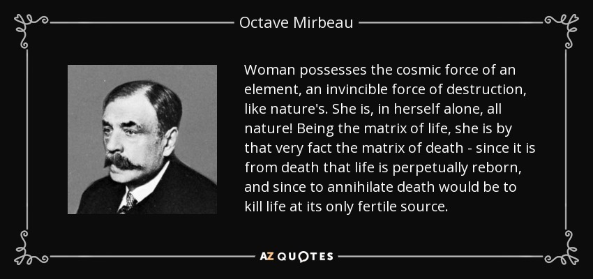 Woman possesses the cosmic force of an element, an invincible force of destruction, like nature's. She is, in herself alone, all nature! Being the matrix of life, she is by that very fact the matrix of death - since it is from death that life is perpetually reborn, and since to annihilate death would be to kill life at its only fertile source.