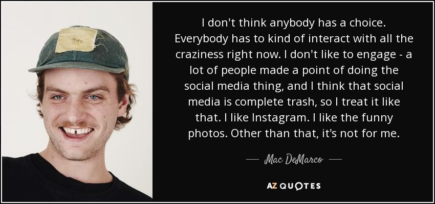 I don't think anybody has a choice. Everybody has to kind of interact with all the craziness right now. I don't like to engage - a lot of people made a point of doing the social media thing, and I think that social media is complete trash, so I treat it like that. I like Instagram. I like the funny photos. Other than that, it's not for me.