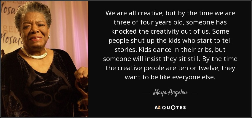 We are all creative, but by the time we are three of four years old, someone has knocked the creativity out of us. Some people shut up the kids who start to tell stories. Kids dance in their cribs, but someone will insist they sit still. By the time the creative people are ten or twelve, they want to be like everyone else.