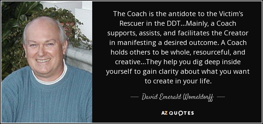 The Coach is the antidote to the Victim's Rescuer in the DDT...Mainly, a Coach supports, assists, and facilitates the Creator in manifesting a desired outcome. A Coach holds others to be whole, resourceful, and creative...They help you dig deep inside yourself to gain clarity about what you want to create in your life.