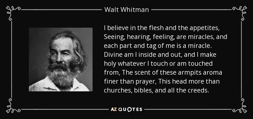 I believe in the flesh and the appetites, Seeing, hearing, feeling, are miracles, and each part and tag of me is a miracle. Divine am I inside and out, and I make holy whatever I touch or am touched from, The scent of these armpits aroma finer than prayer, This head more than churches, bibles, and all the creeds.