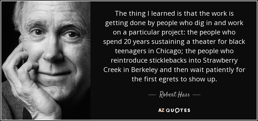 The thing I learned is that the work is getting done by people who dig in and work on a particular project: the people who spend 20 years sustaining a theater for black teenagers in Chicago; the people who reintroduce sticklebacks into Strawberry Creek in Berkeley and then wait patiently for the first egrets to show up.