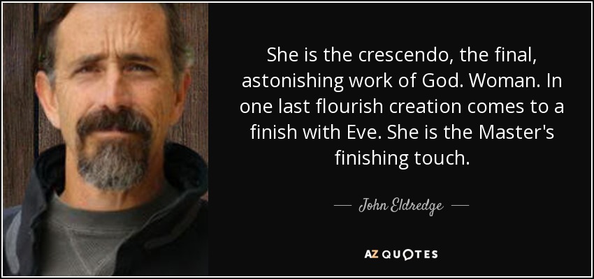 She is the crescendo, the final, astonishing work of God. Woman. In one last flourish creation comes to a finish with Eve. She is the Master's finishing touch.