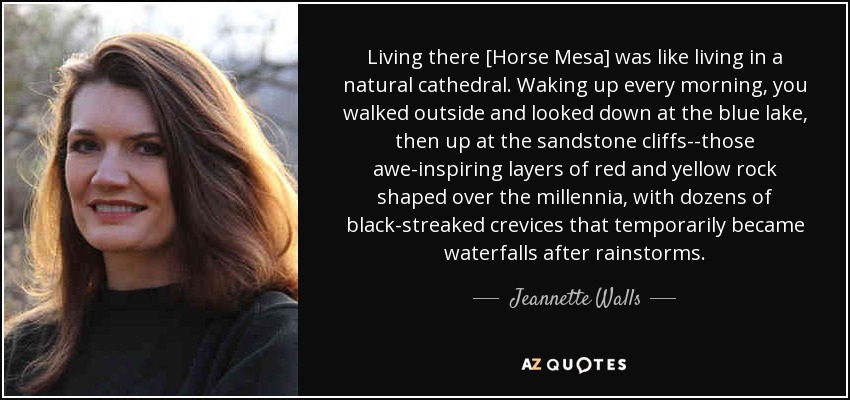 Living there [Horse Mesa] was like living in a natural cathedral. Waking up every morning, you walked outside and looked down at the blue lake, then up at the sandstone cliffs--those awe-inspiring layers of red and yellow rock shaped over the millennia, with dozens of black-streaked crevices that temporarily became waterfalls after rainstorms.