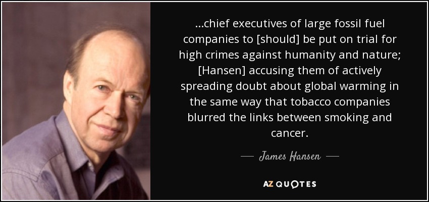 ...chief executives of large fossil fuel companies to [should] be put on trial for high crimes against humanity and nature; [Hansen] accusing them of actively spreading doubt about global warming in the same way that tobacco companies blurred the links between smoking and cancer.