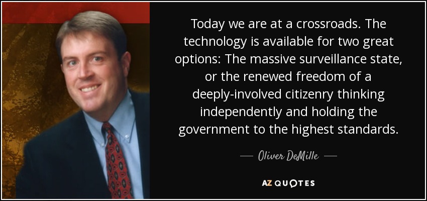 Today we are at a crossroads. The technology is available for two great options: The massive surveillance state, or the renewed freedom of a deeply-involved citizenry thinking independently and holding the government to the highest standards.
