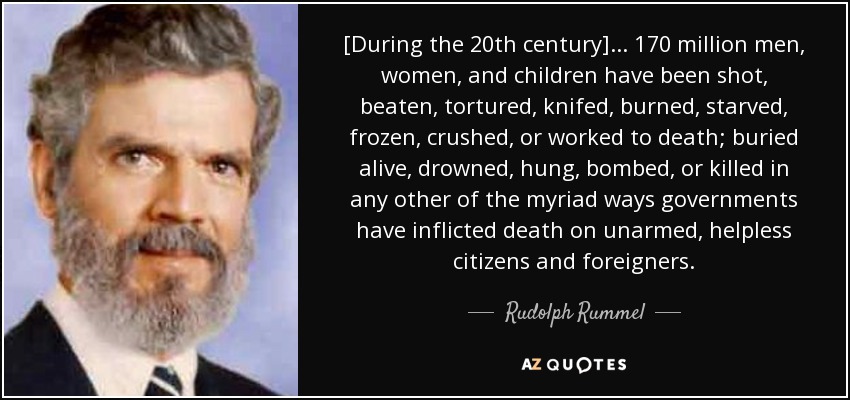 [During the 20th century] ... 170 million men, women, and children have been shot, beaten, tortured, knifed, burned, starved, frozen, crushed, or worked to death; buried alive, drowned, hung, bombed, or killed in any other of the myriad ways governments have inflicted death on unarmed, helpless citizens and foreigners.